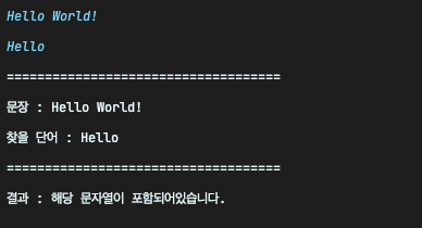 - 문장과 단어를 입력받은 뒤 단어가 문장에 포함되어있는지 확인하는 예제입니다.