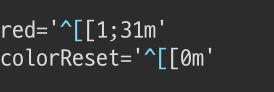 파일로 확인하면 위 처럼 다른 색으로 표시가 되어있는 것을 볼 수 있습니다. 여기서 red 변수의 값은 빨간색으로 설정하는 코드이고 colorReset 변수의 값은 원래 상태로 돌아가는 코드입니다.