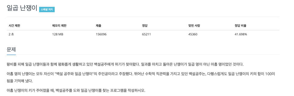 문제를 확인해보면 9명의 난쟁이의 키를 input 값으로 받는 것을 알 수 있습니다. input 값이 많지 않으므로 정답을 도출하는 데에 전체 탐색을 해도 괜찮을 것 같다는 생각을 했습니다.