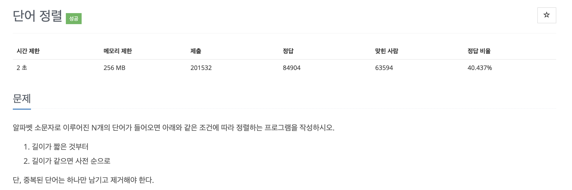 중복된 단어가 input 값으로 주어지면 제거 해줘야 한다는 것과 단어의 길이 및 단어로 정렬하는 다중 정렬 조건이 있다는 것을 알 수 있습니다.