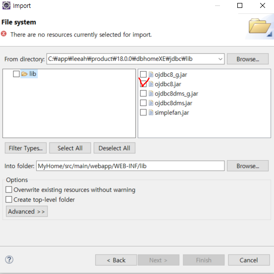 여기서 ojdbc8.jar파일을 선택해주고 finish를 눌러주게 되면 lib폴더에 선택한 jar파일이 import 되고