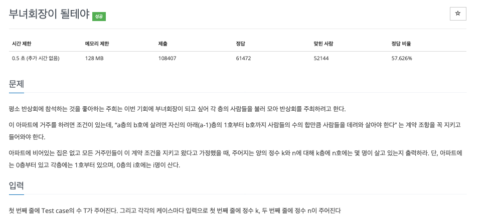 input 값의 범위 1 <= k,n <= 14아파트 0층의 i호는 i명이 산다는 조건이 있습니다. 0층의 1호부터 14호까지의 인원수를 조건에 맞게 저장합니다.또 규칙을 따르면 아파트 각 층의 0호는 1명만 거주하게 되어있습니다. 따라서 이 값도 초기값으로 배열에 저장합니다.
