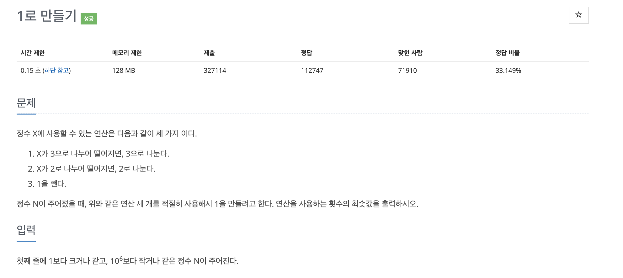 정수가 주어졌을 때 그 정수를 1로 만들려하는 과정에 사용되는 연산의 횟수의 최소값을 구하는 것이다 보니 연산횟수가 0 입니다.