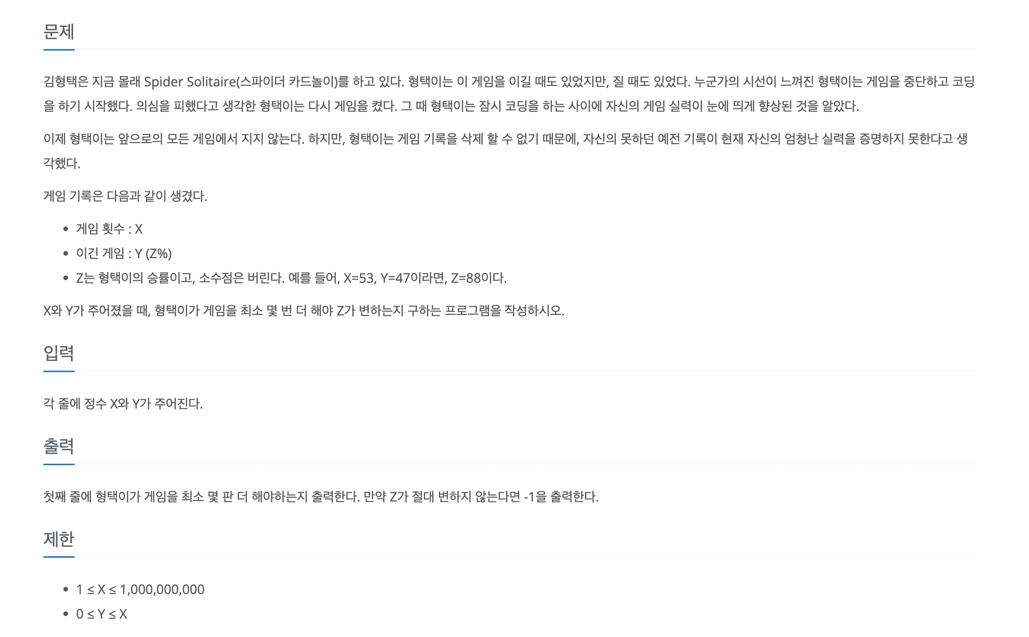 최소 몇번의 게임을 해야 승률이 변하는지 구해야하기에 게임을 추가로 하는 횟수는 1이상 X이하일 것입니다. (현재 게임횟수의 2배를 하게되면 승률의 변동이 무조건 있을 것이기 때문)