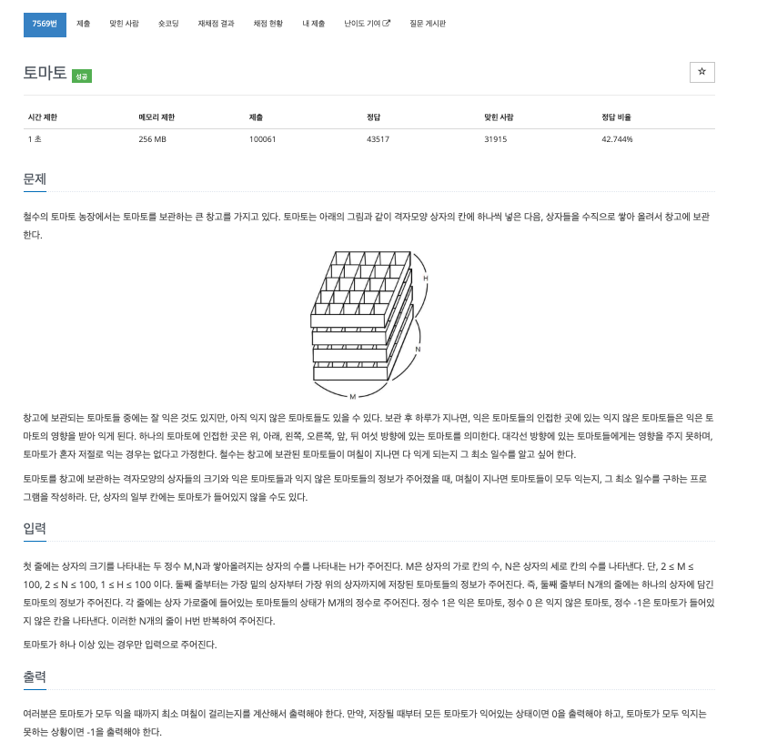 너비우선탐색 알고리즘을 활용하여 문제 풀면 토마토가 모두 익을때까지 며칠이 걸리는 지 구할 수 있습니다.