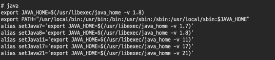 저는 java 버전이 1.7 / 1.8 / 11 / 17 / 21 이 설치되어있기때문에 기본 버전은 1.8로 세팅하고 명령어를 통해서 버전을 변경해서 사용할 수 있도록 위 처럼 작성해두었습니다. 현재 맥에 설치되어있는 java 버전 대로 활용해주시면 됩니다.