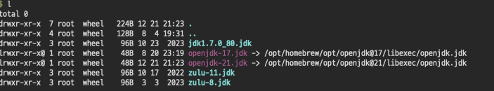 그리고 macOS의 java virtual machine 경로는 /Library/Java/JavaVirtualMachines 이고 해당 디렉토리 하위에 설치한 jdk들을 확인할 수 있는데 openjdk 21 버전이 해당 디렉토리에서 확인되지 않습니다. 따라서 심볼링 링크를 걸어서 openjdk21 버전을 맥의 Java Virtual Machine에서 사용할 수 있도록 해줘야합니다.