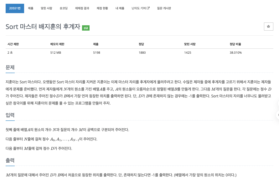 이분 탐색으로 문제를 풀이하면 되는데 문제의 조건 중에서 질문에서 주어진 정수 D가 정렬된 배열 B에서 가장 먼저 등장한 위치를 출력해주면 된다는 조건으로 인해 이분탐색으로 답이 나왔을 때 그 앞의 원소 들중에서 다시한번 탐색을 진행해서 풀 수 있었습니다.
