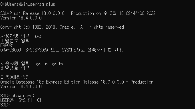 sqlplus 에서 sys 계정으로 로그인하기 위해 sys를 입력하면 위와 같은 에러메세지가 나옵니다.