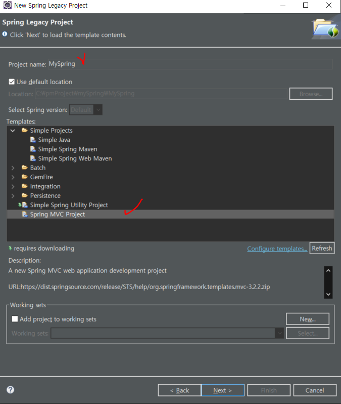new Project에서 Spring Legacy Project를 클릭해주고 next