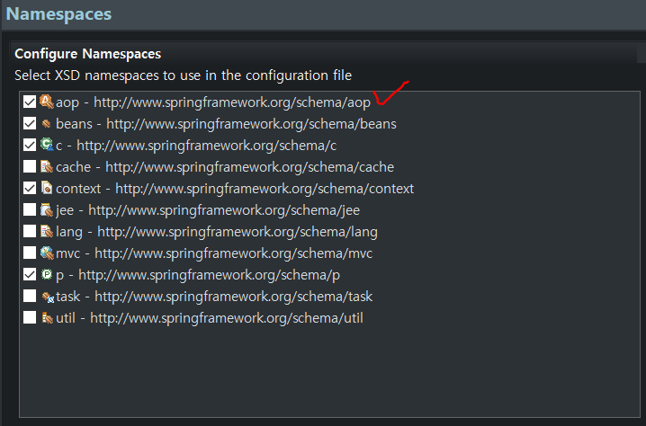 위 코드를 추가해준 다음 스프링 설정파일에서 네임스페이스에서 AOP를 추가해주면 됩니다.