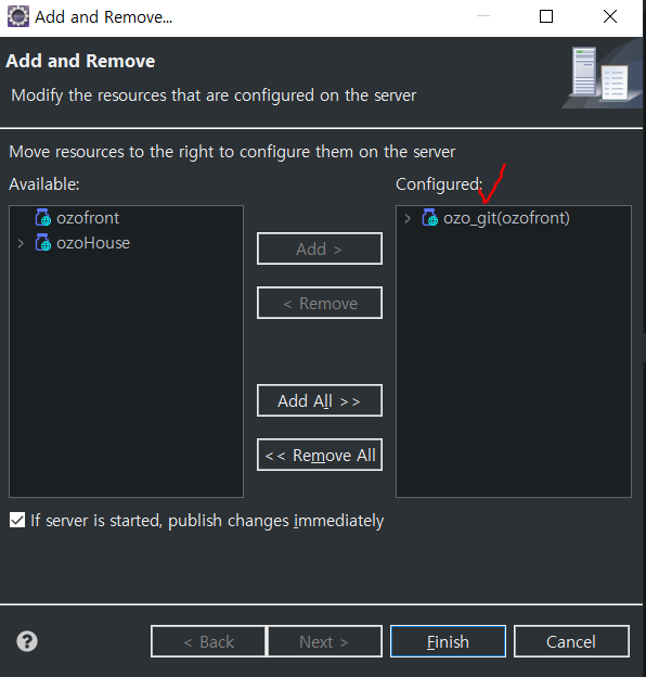 server를 우클릭 해보았을 때 Add and Remove를 눌러봐도 현재는 보이는 ozo_git 프로젝트가 보이지 않았었습니다.