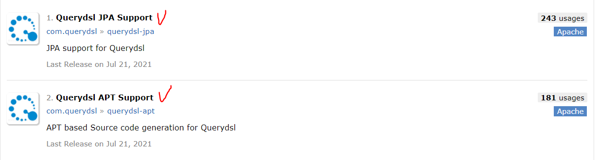 MavenRepository 사이트에서 querydsl을 검색하고 체크한 두 개의 코드를 가지고 오면 됩니다.