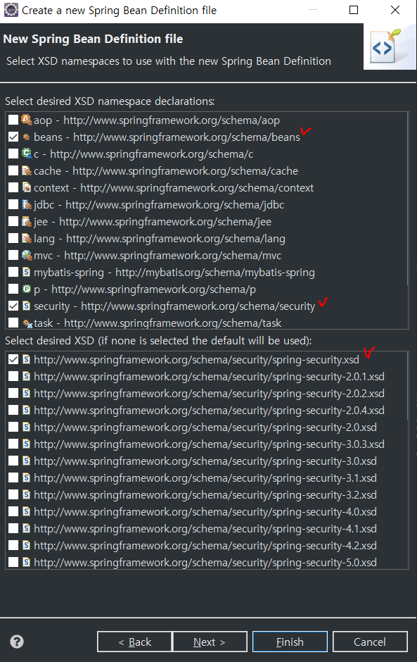 WEB-INF폴더 안에 config라는 폴더를 생성해서 security-config이라는 이름으로 Spring Bean Configuration File을 생성합니다. file name을 입력하는 란이 나올 거고 거기에 이름을 설정해두고 next를 눌러줍니다.