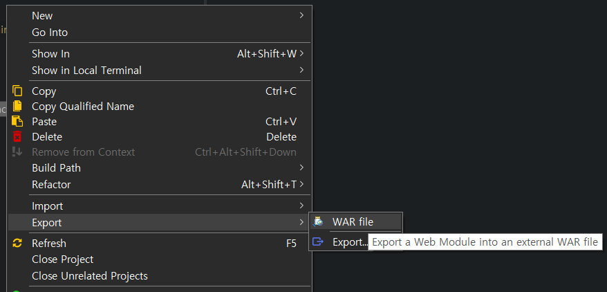 우선 war파일로 생성할 프로젝트를 우클릭해서 위 사진처럼 클릭해줍니다.