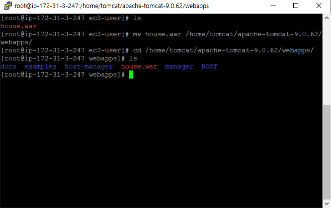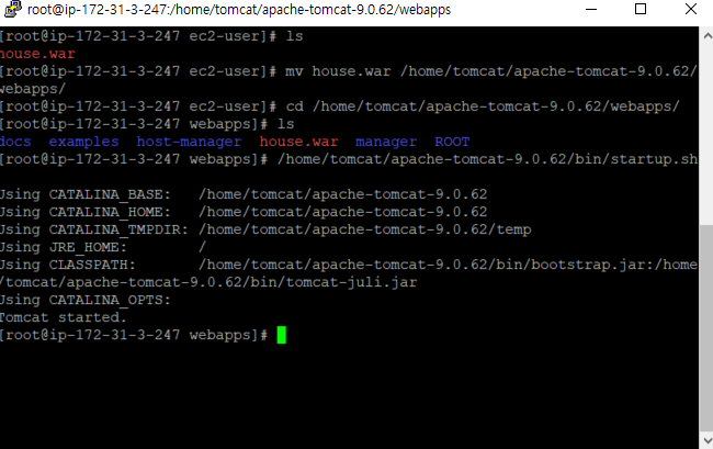 putty를 통해 원격 서버에 접속해서 확인해보면 house.war파일이 정상적으로 전송된것을 알 수 있고