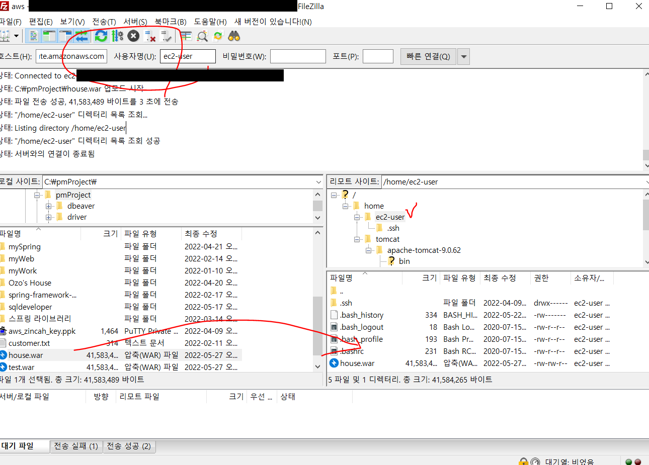 그 다음 Filezilla를 통해서 연결된 원격 서버로 war파일을 이동시킵니다. 현재 사용자가 관리자가 아니기 때문에 접근할 수 있는 폴더로 war파일을 넣어주고 그 후에 putty를 통해서 파일을 이동시켜주면 됩니다.